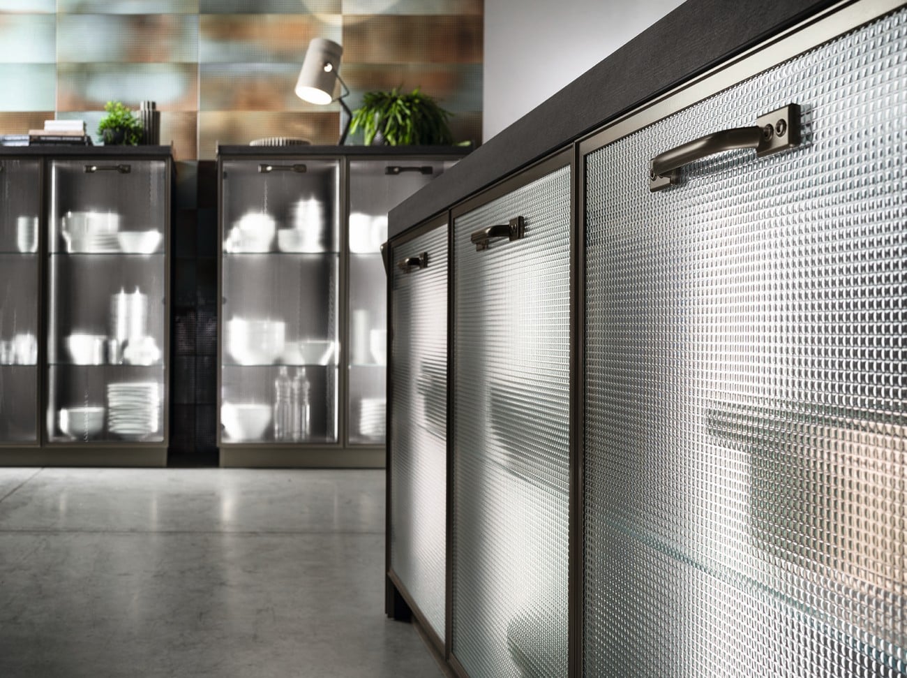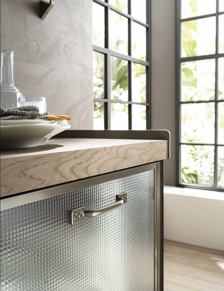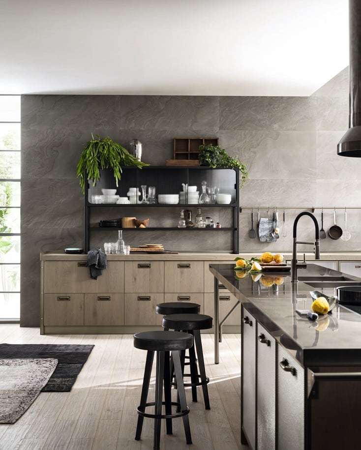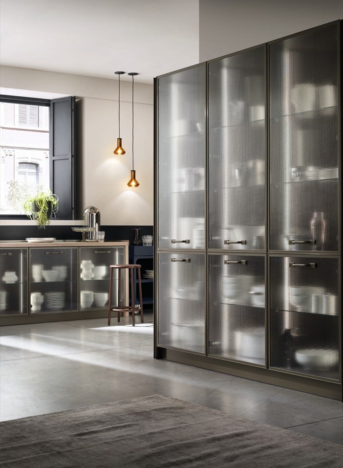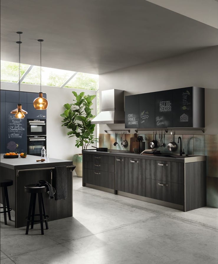 Yhdistä Titanium-kehykset, Soft Industrial Glass -lasi ja Misfits-kokoelma luodaksesi tilan, joka on yhtä aikaa keittiö ja olohuone.