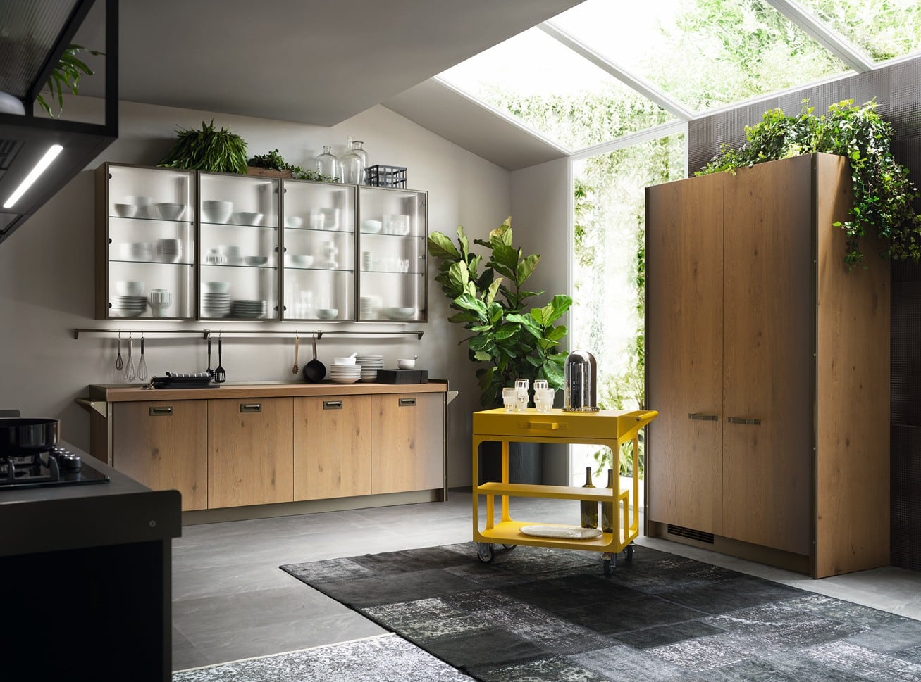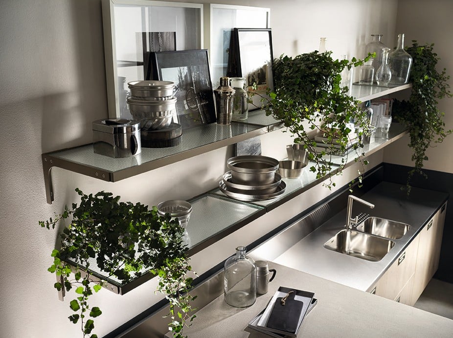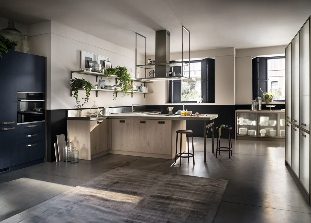 Yhdistä Titanium-kehykset, Soft Industrial Glass -lasi ja Misfits-kokoelma luodaksesi tilan, joka on yhtä aikaa keittiö ja olohuone.