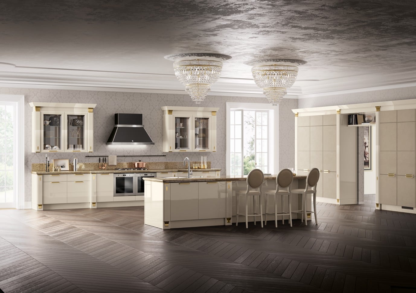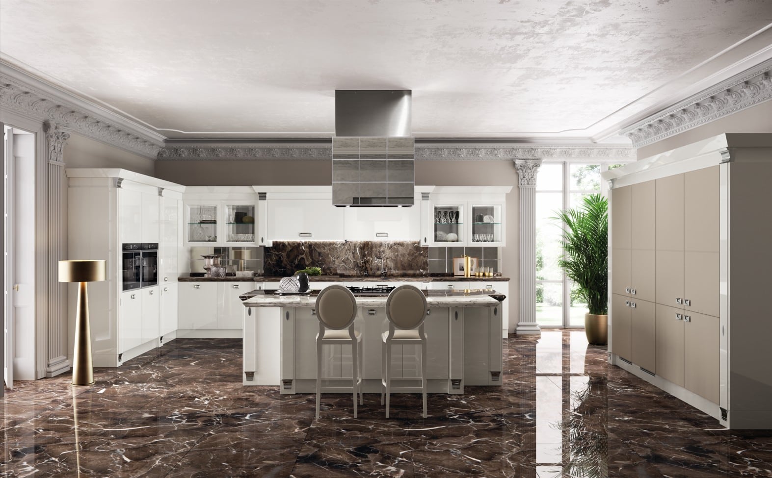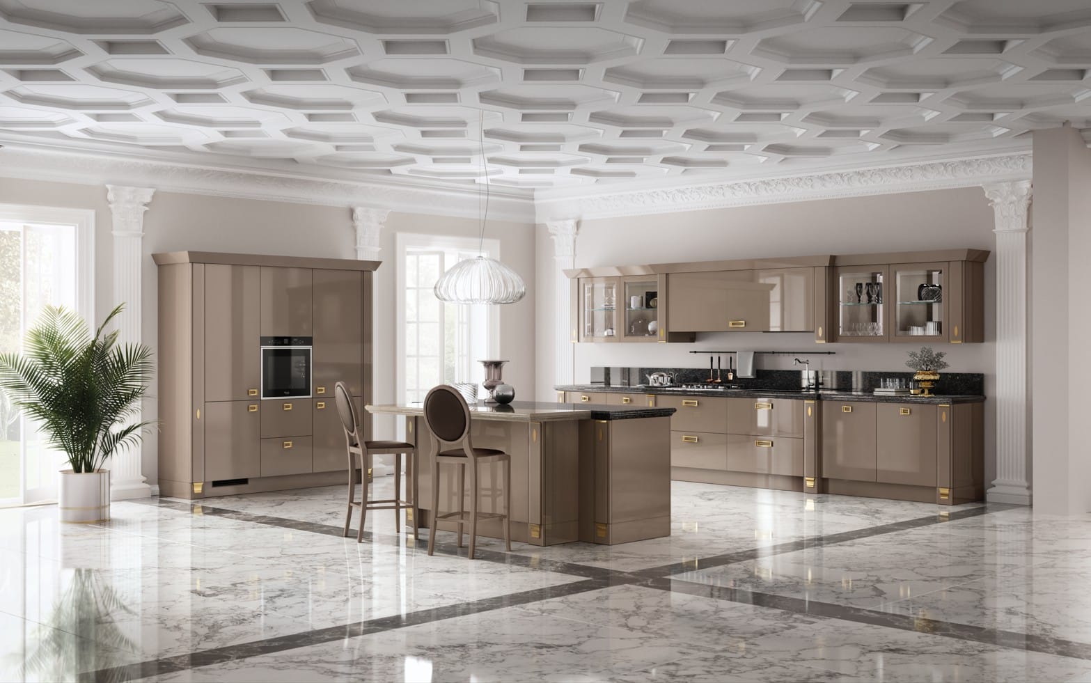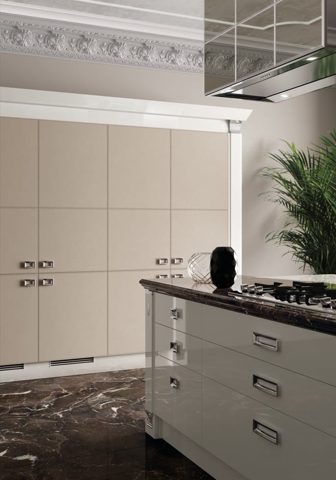 Räätälöi Exclusiva täysin omaksesi. Valitse nahkaovet kolmessa värissä (Plaster, Pearl Grey, Ebony), lisää Emperador-marmoriset työtasot ja Stopsol-peililaatat liesituulettimeen. Mattalakatut tai kiiltävät pinnat, kulta- tai kromiyksityiskohdat, friisit ja pilasterit – jokainen yksityiskohta on käsityötä ja puhdasta luksusta. Exclusiva on Made in Italy -sertifioitu, mikä tarkoittaa, että materiaalit, suunnittelu ja valmistus ovat sataprosenttisesti italialaista laatua.