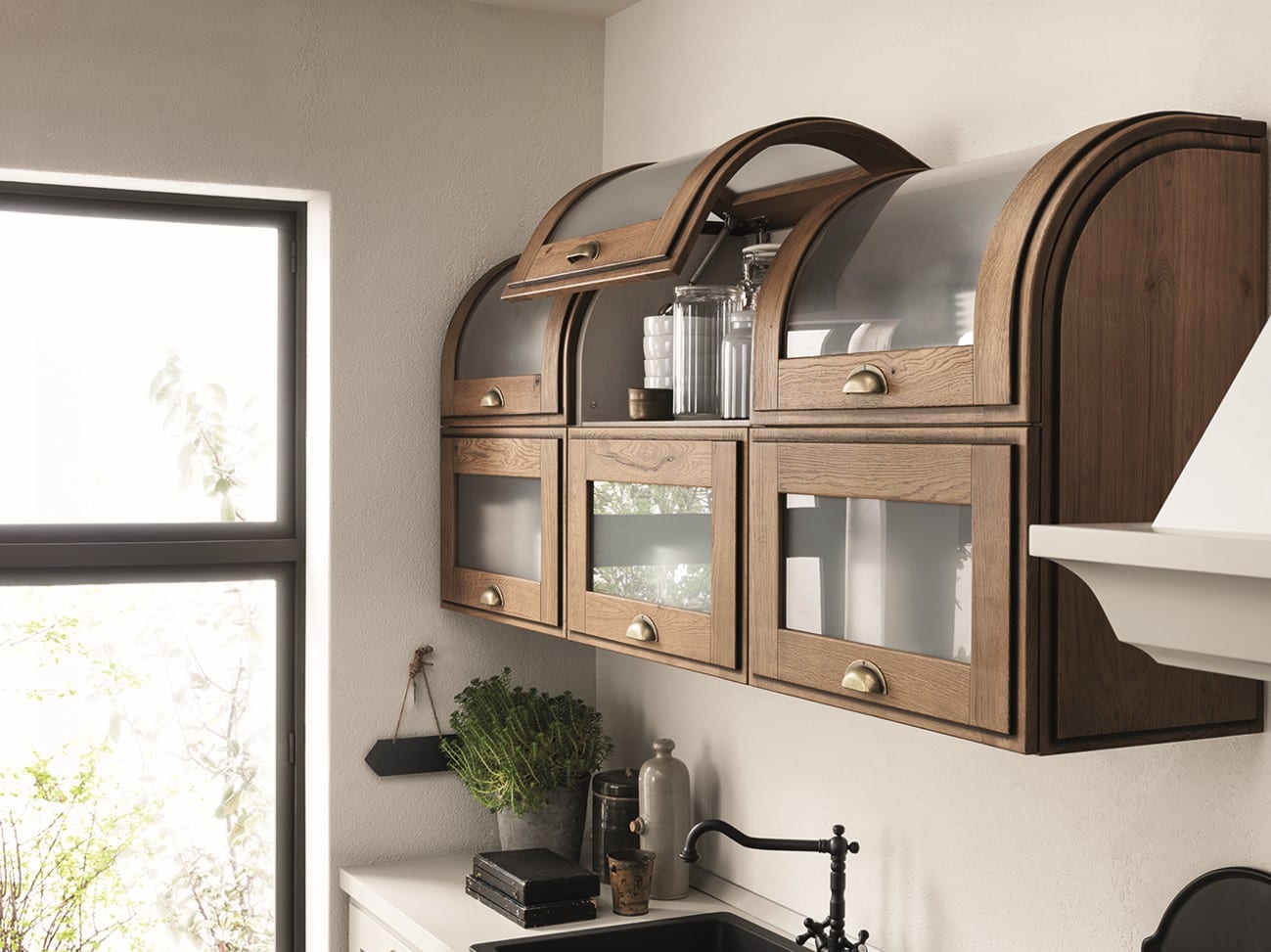 Yhdistä oksainen tammi, lasivitriinikaapit ja Borgo-tiilipinta ajattomaksi country-kokonaisuudeksi.