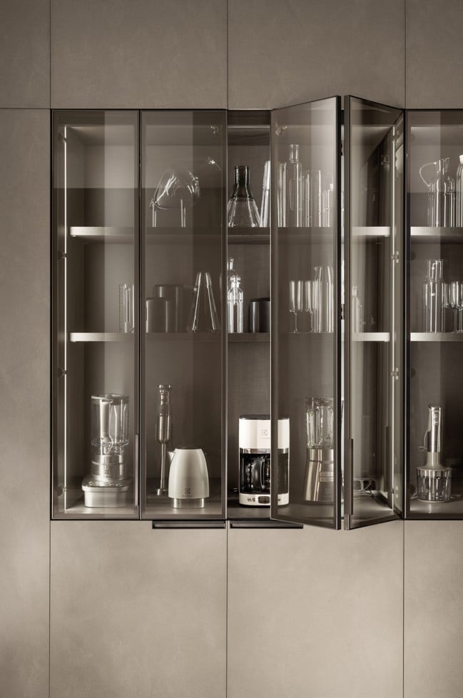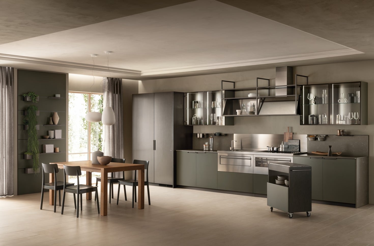 Varusta Mia ammattilaislaitteilla, joita Carlo Cracco itse käyttää: vakumointilaatikko marinointitoiminnolla, food warmer -lamppu lämpimänäpitoon, dehydrator kuivaukseen, proofing oven kohottamiseen. Valitse pinnoista: Pinstripe Oak, Dark Steel, Stopsol glass, Clay Biomalta tai Fenix®. 12 mm terästyötasot integroidulla pesualtaalla, roikkuva säilytysrakenne näkyvällä astiankuivaustelineellä ja Line System -varusteet (yrttitarha, pullotelineet, magneettinen veitsiritilä) tekevät Miasta todellisen ammattilaisen työpisteen. Trolley-apuvaunu, lipasto pyörillä ja leikkuulaudat reiällä hävikille täydentävät kokonaisuuden. Keittiö, joka puhuu rakkaudesta ruoanlaittoon, raaka-aineisiin ja autenttiseen kokkaukseen – “two excellences which share a single great passion”.