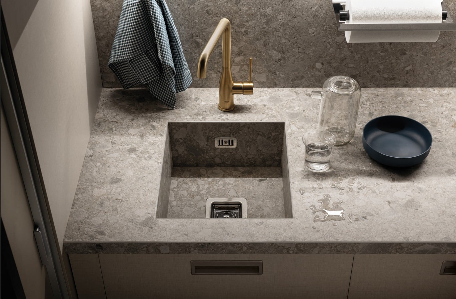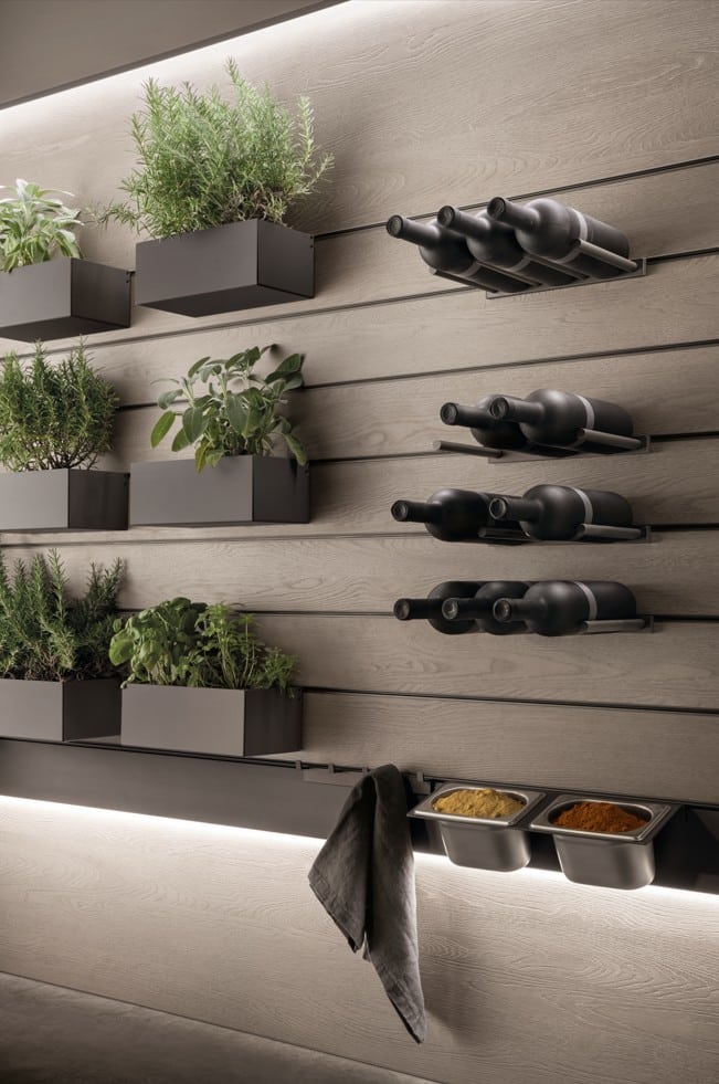 Yhdistettynä Line System -seinäpaneeleihin (yrttitarha, pullotelineet, magneettinen veitsiritilä, koukut ja hyllyt) saat työpisteen, jossa kaikki on käden ulottuvilla. 25 cm metallinen upotettava kahva, 80 cm alakaapit ja 7 cm sokkeli parantavat ergonomiaa ja säilytystilaa. 12 mm terästyötasot integroidulla pesualtaalla ja trolley-apuvaunu viimeistelevät kokonaisuuden. Tämä on keittiö niille, jotka haluavat “maximum quality, day-in day-out”.