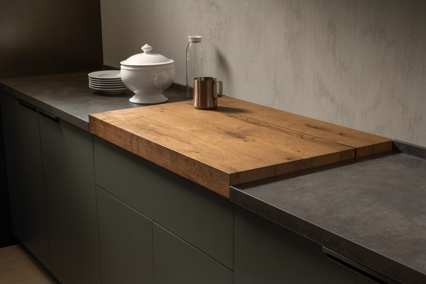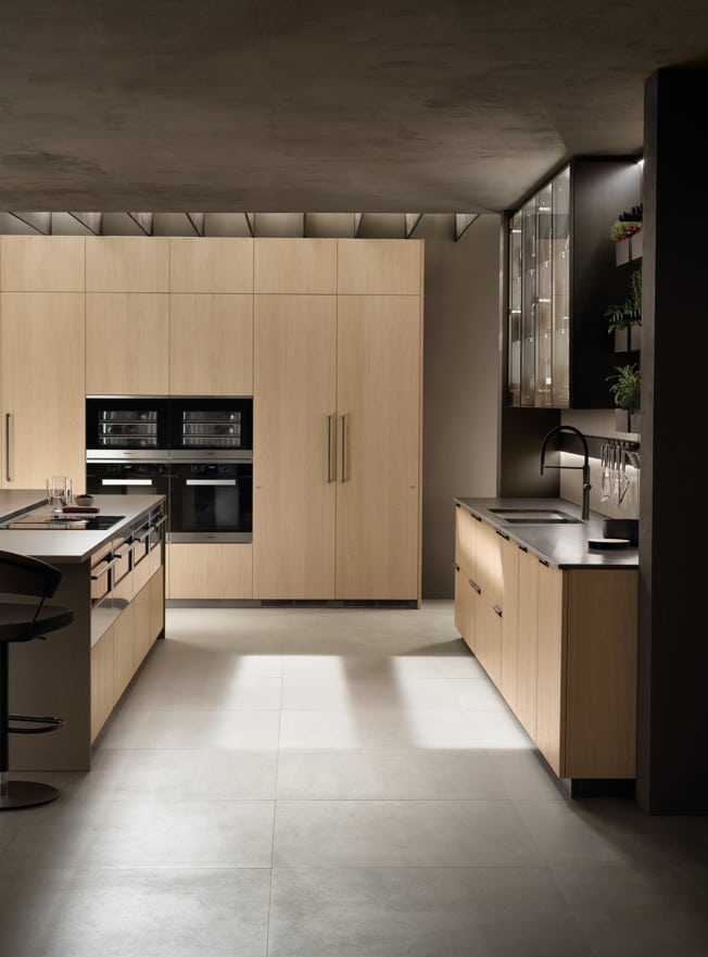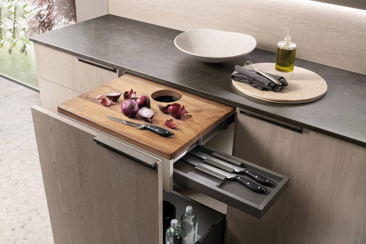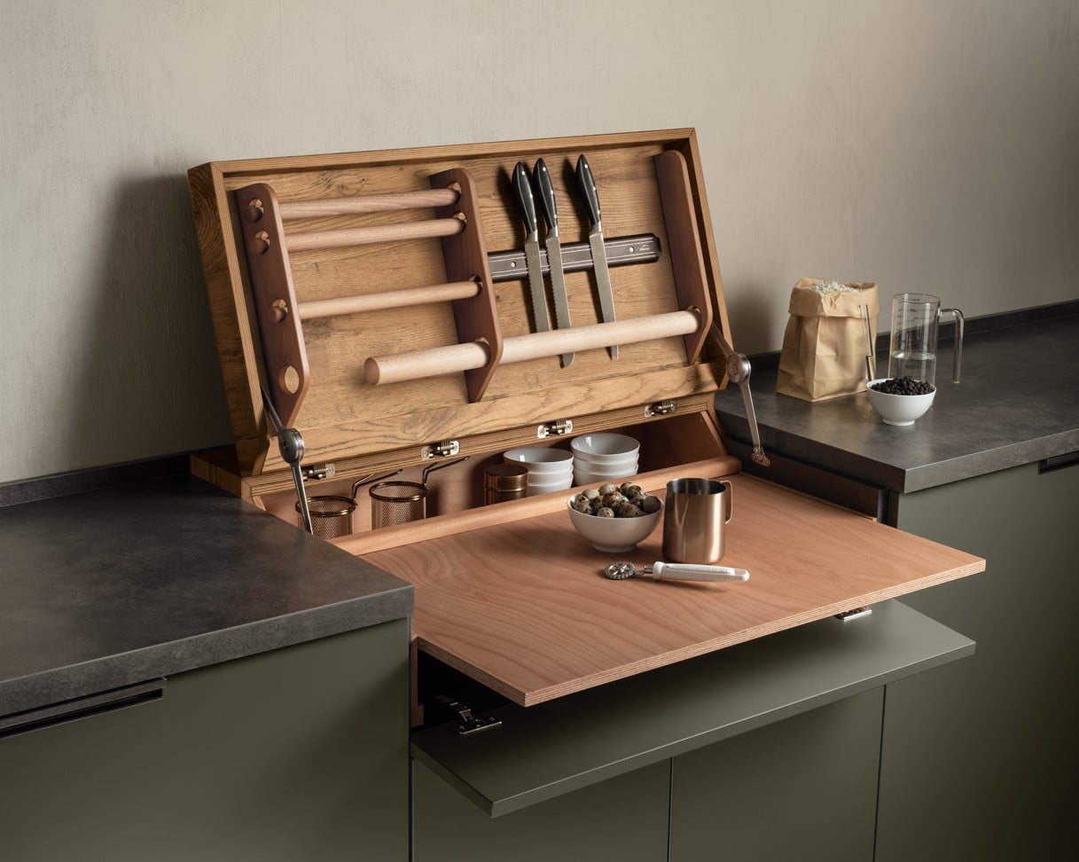 Craccon yli 30 vuoden kokemus ammattilaiskeittiöistä yhdistettynä Scavolinin ylivertaiseen valmistuslaatuun loi “outstanding domestic interpretation of the professional kitchen” – keittiön, joka kunnioittaa raaka-aineita, vähentää hävikkiä ja mahdollistaa ammattilaistasoisen ruoanlaiton. 25 cm metallinen upotettava kahva (horisontaalisesti alakaapeissa, vertikaalisesti korkeissa), 80 cm korkeat alakaapit ja Line System -seinäpaneelijärjestelmä luovat “compositional rigour” – tarkan sommittelun, joka seuraa ammattilaiskeittiön logiikkaa: valmistelu → pesu→pilkkominen → kypsentäminen. “The keyword is professionalism” – Mian lupaus.
