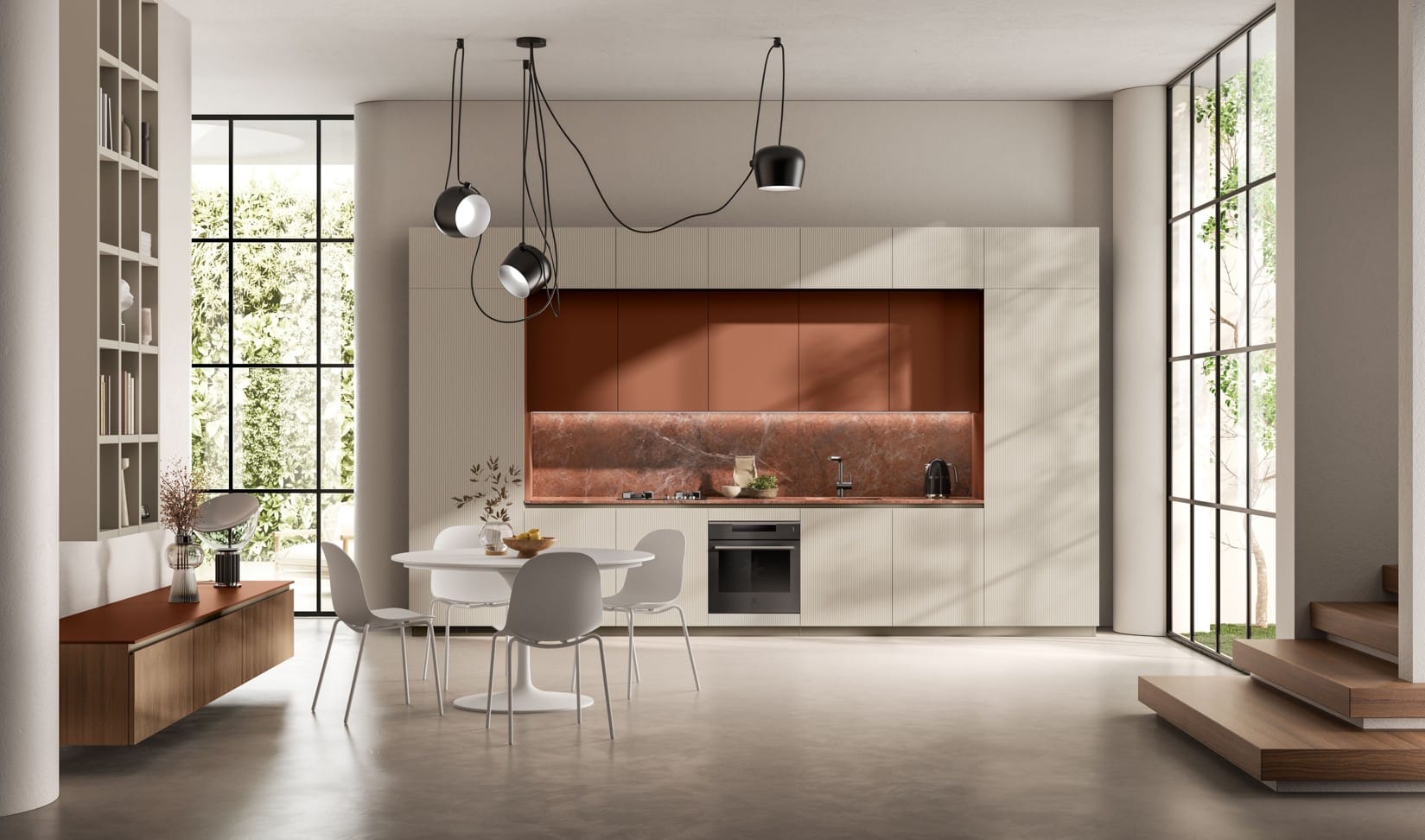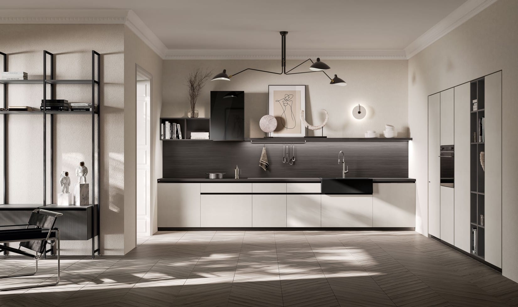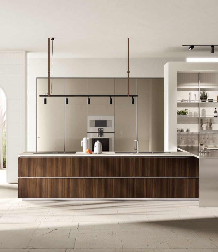 “Quiet luxury” on muoti- ja sisustusmaailman trendi, joka korostaa hillittyä eleganssia ja laadukkaita yksityiskohtia näyttävyyden sijaan. Jos etsit keittiötä, joka on sofistikoitu ilman teatraalisuutta tai ammattilaiskeittiön tekniikkakeskeisyyttä, Mira on oikea valinta. Tämä on “striking simplicity” – puhdas linja ja tarkkaan mietitty yksityiskohtaisuus. L-muotoinen ovinprofiili, upotettavalla kahvaprofiililla viimeistelty sivupaneeli ja pearlescent-sävyjen paletti (Cuvée, Pas Dosé, Perlage) luovat “understated appeal” – hillityn vetovoiman. Formalia on kokonainen home system, Jeometrica taiteellinen tulkinta, mutta Mira edustaa hiljaista luksusta: “for those in search of a clean-cut and at the same time elegant design”. Eleganssia, joka kuiskaa.