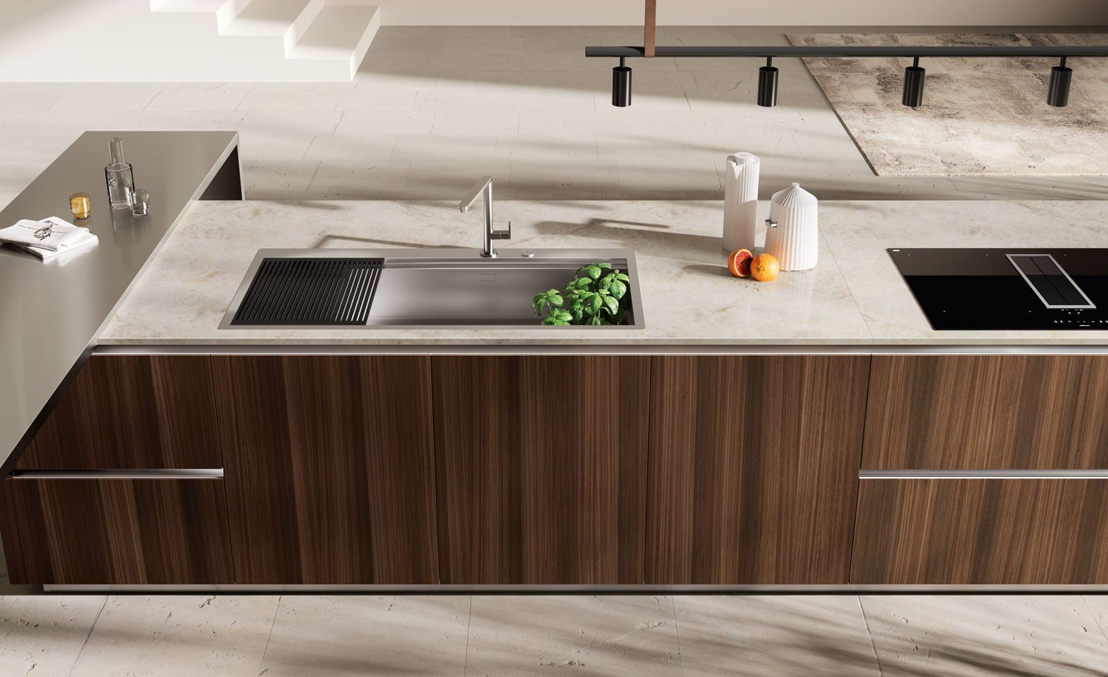 Yhdistettynä Flat- tai Round-upotettavaan kahvaprofiiliin, sivupaneeleihin samalla profiililla ja 75 cm modulaarisuuteen (alakaapeissa ja seinäkaapeissa) syntyy kokonaisuus, joka on yhtä aikaa “impeccably detailed” ja käytännöllinen. Dark Steel -alumiinirunko-ovet Round- tai Linear-verkolla, slat-tekstuurit ja “overhead”-ratkaisu seinäkaappien yläpuolella tuovat arkeen toiminnallista eleganssia. Antibakteerinen Contempo-monobloc-alllas, integroidut valaistusratkaisut sekä 75 cm mitoitus, joka mahdollistaa “latest generation of built-in appliances”, täydentävät modernin käyttömukavuuden. Yksityiskohdat, jotka tekevät eron.