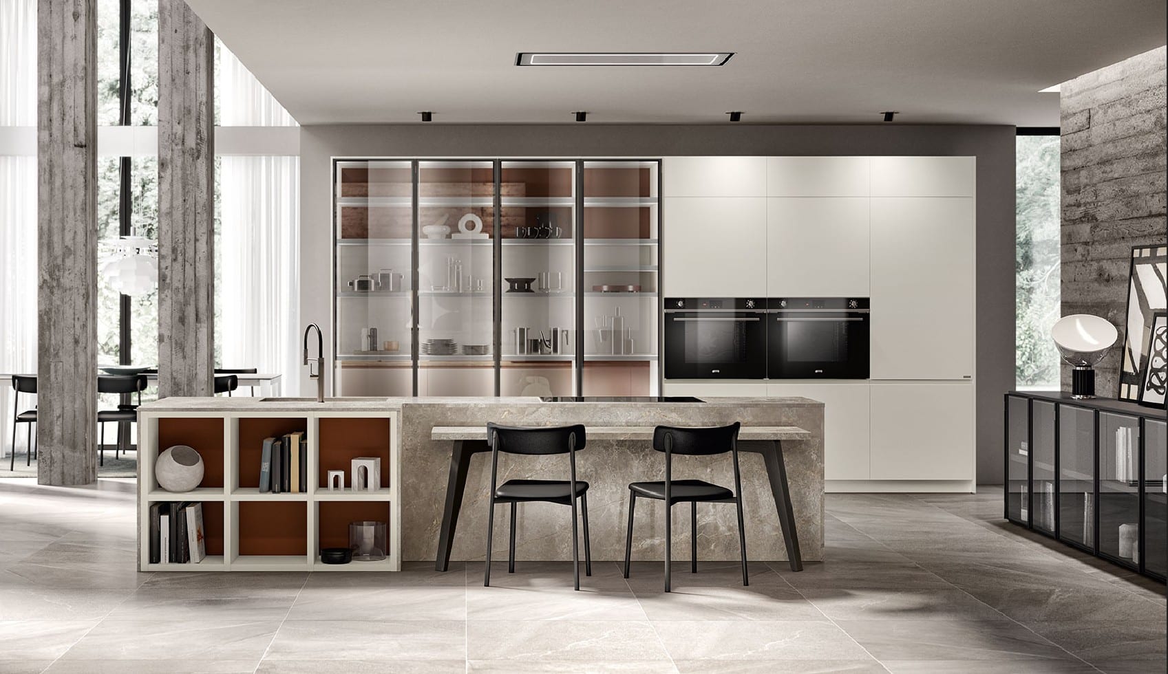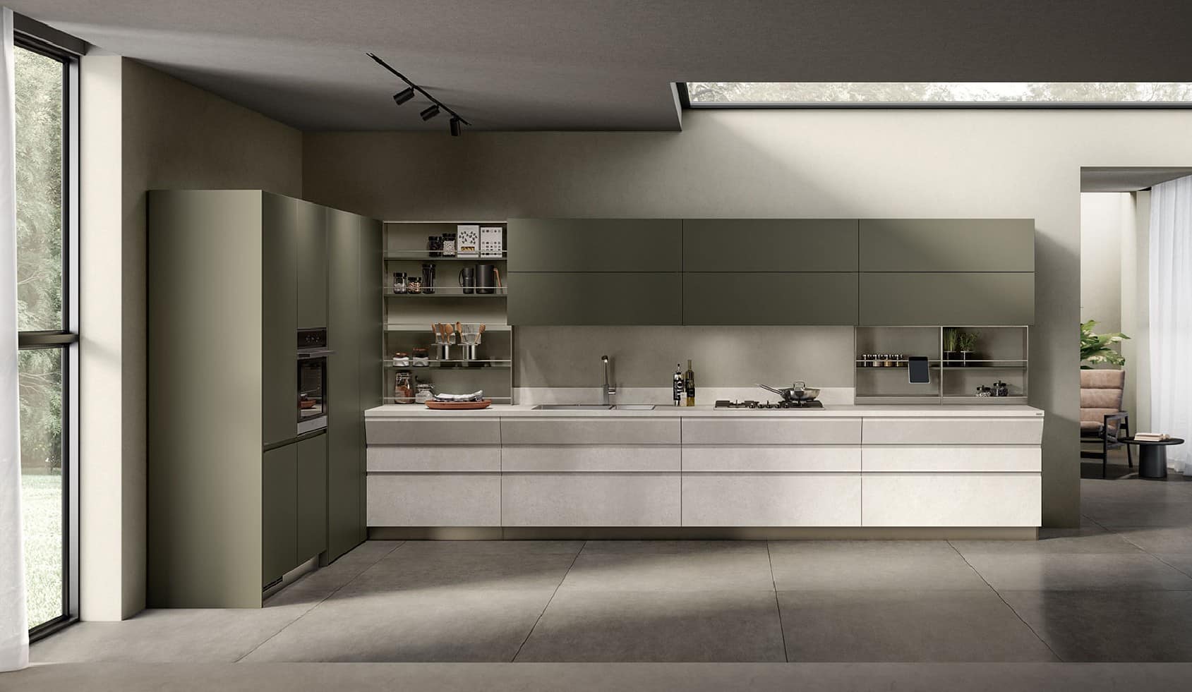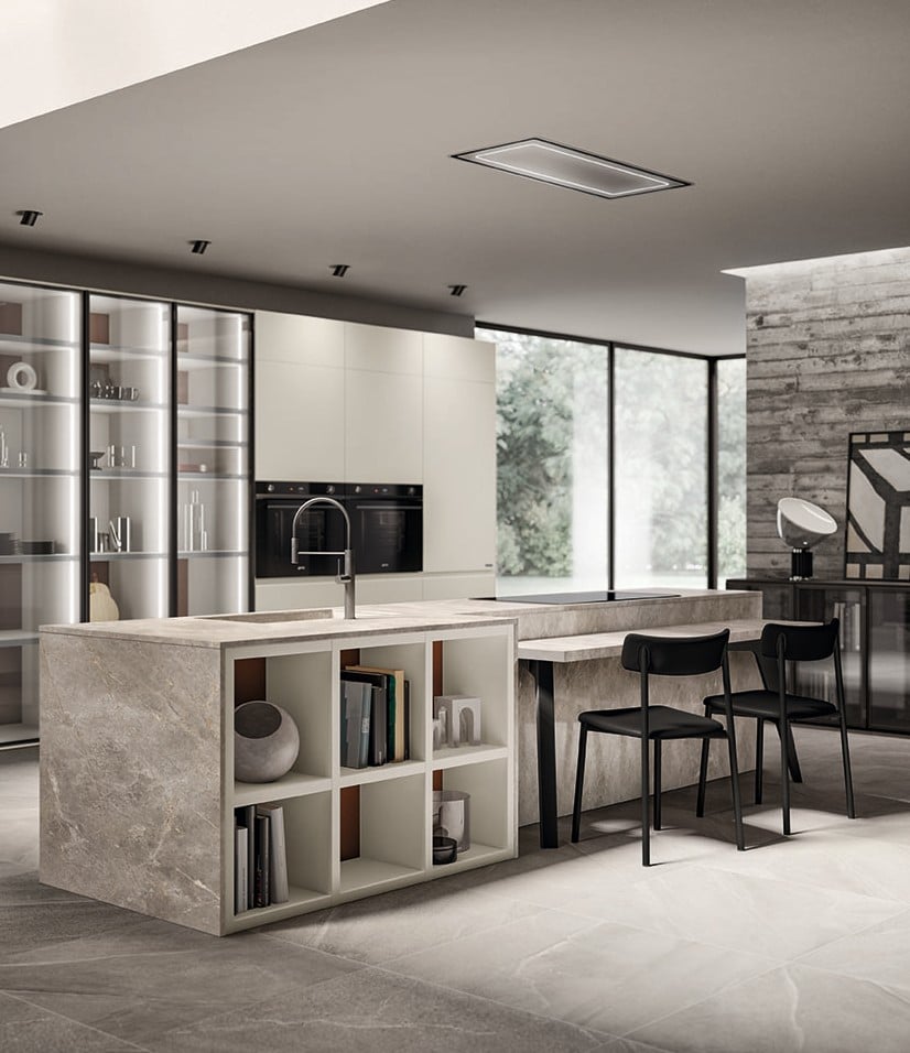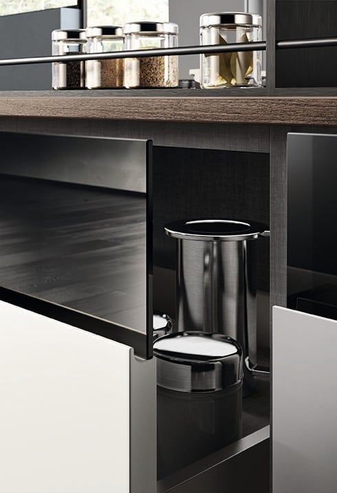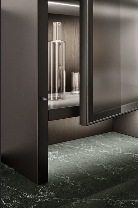 Motuksen tunnusomainen piirre on sen tapa yhdistää keittiö ja olohuone saumattomasti Fluida Wall System -järjestelmän avulla. Seinälle kiinnitettynä tai vapaasti seisovana avohyllyjen ja kaappien kokonaisuus toimii tiloja yhdistävänä elementtinä ja luo monikäyttöisen ympäristön ilman kiinteitä väliseiniä. 65 cm syvät, eteenpäin työntyvät laatikot terävässä kulmassa – Vittore Niolun suunnittelema geometristen linjojen erityispiirre – tuovat sekä runsaasti säilytystilaa erityisesti altaan ja lieden alle että visuaalista rytmiä. Vetimettömät ovet epäsymmetrisellä otteella sekä muotoillut geometriset laatikot viimeistelevät hillityn mutta tyylikkään ilmeen. Opus-, Sign- ja Setup-järjestelmät pitävät tarvikkeet järjestyksessä ja helposti saatavilla. Yksityiskohdat muodostavat kokonaisuuden, joka antaa tilalle uuden identiteetin ja vahvan luonteen.