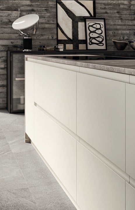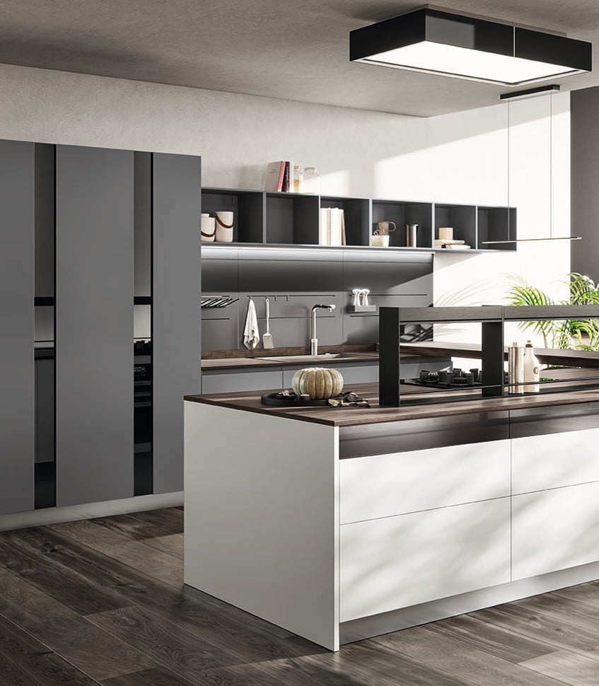 Vittore Niolun suunnittelema Motus lähti yhdestä oivalluksesta: elämä muuttuu – miksei keittiö muuttuisi sen mukana? Motuksen itsenäiset elementit voi purkaa, koota ja yhdistää uudelleen tilan ja tarpeiden mukaan. Tämä ei ole perinteinen kiinteä keittiökokonaisuus, vaan ratkaisu, jossa on käytännössä rajaton määrä kokoonpanovaihtoehtoja. Vetimettömät ovet epäsymmetrisellä otteella (ote alakaappien yläosassa ja korkeiden kaappien alaosassa), 65 cm syvät eteenpäin työntyvät laatikot terävässä kulmassa sekä muotoillut geometriset laatikot luovat poikkeuksellisia linjoja ja tuovat tilaan liikettä. Fluida Wall System toimii sillanrakentajana keittiön ja olohuoneen välillä, yhdistäen toiminnallisuuden ja viihtyisyyden, yksityisyyden ja kodikkuuden.