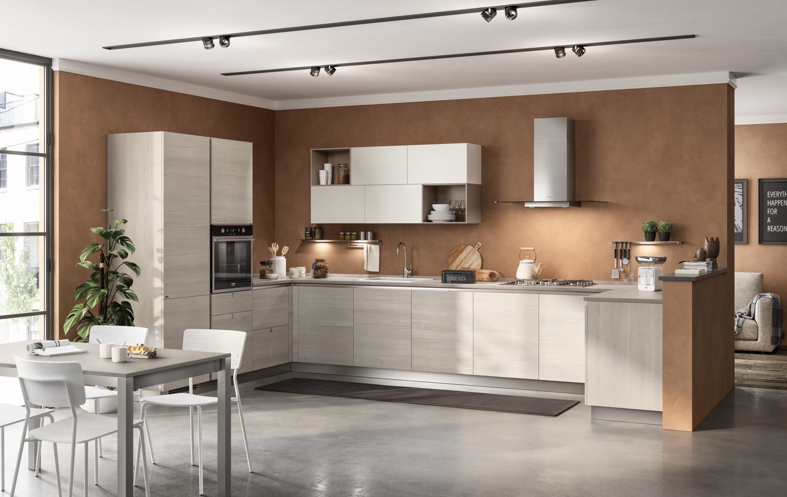 Urbanin ydin on käytännöllisyys. Land Oak -laminaattityötaso (4 cm) muodostaa kestävän ja helppohoitoisen työpinnan, jonka äärellä päivittäinen kokkaus sujuu mutkattomasti. Metro Wall System -panelointi tuo säilytyksen sinne, missä sitä tarvitaan, ja pitää mausteet sekä tarvikkeet käden ulottuvilla. Decorativo Legno -viimeistelyt (Larice Pasha, Eucalipto Taj) tuovat lämpöä ja persoonallisuutta ilman että hinta nousee hallitsemattomaksi. Avohyllyt ja suljetut kaapit luovat tilaan vaihtelua, ja Holdup-tuki tuo aamiaisbaarin osaksi arkea. Urban Minimal -version gola-vedin sulauttaa keittiön luontevasti oleskelutilaan ja antaa harmonisen, yhtenäisen ilmeen. Tämä on yksinkertaisuutta, joka toimii päivästä päivään.