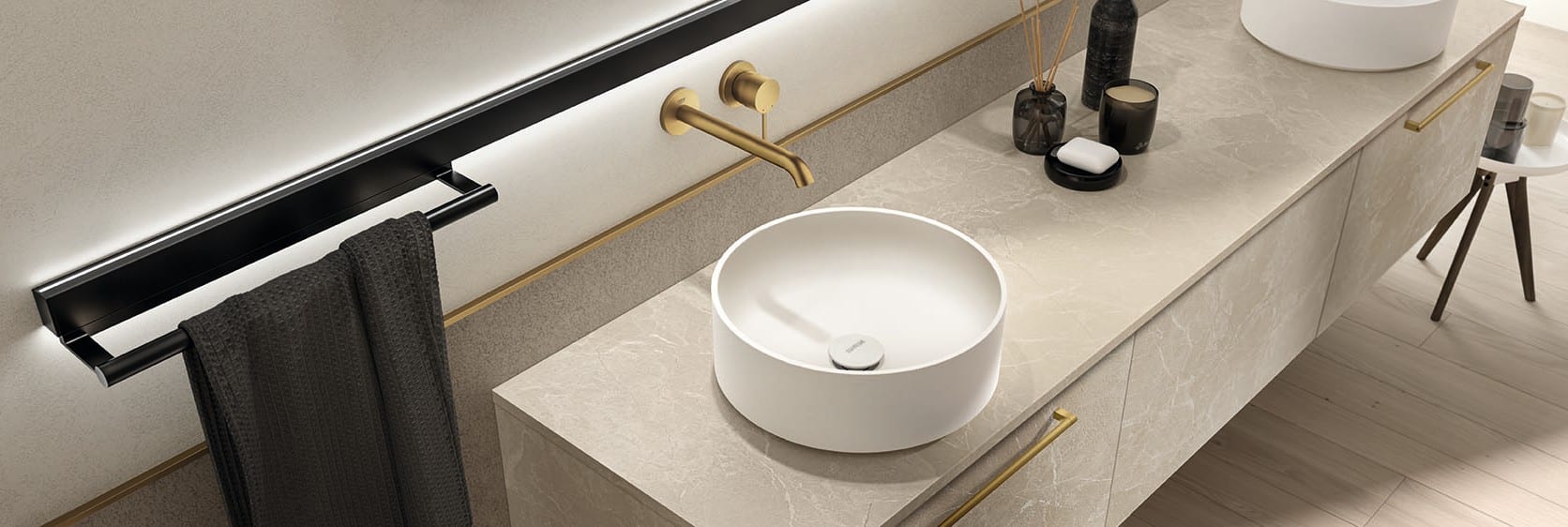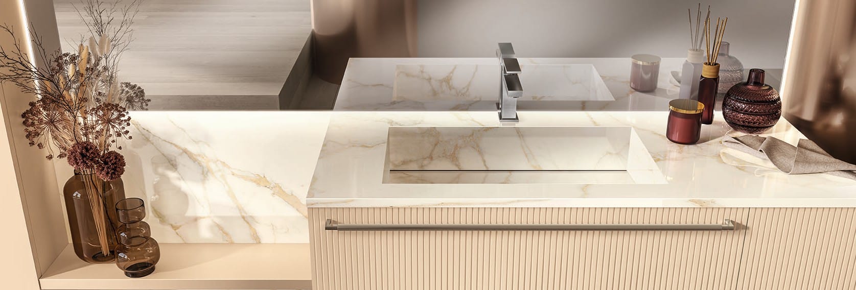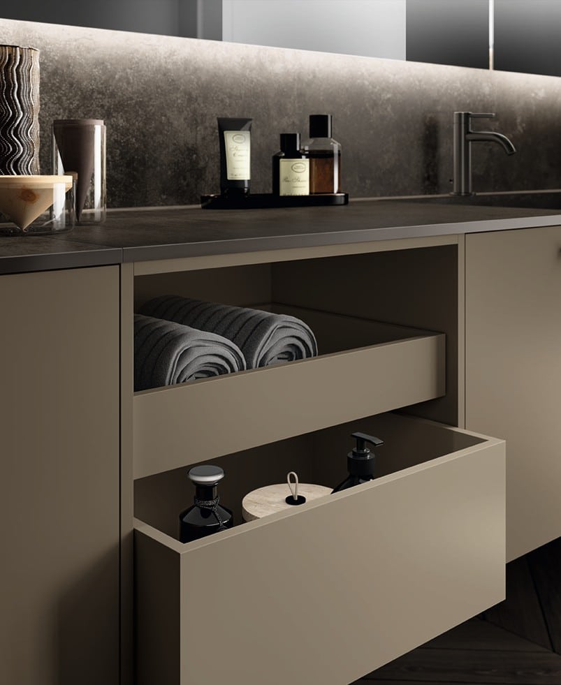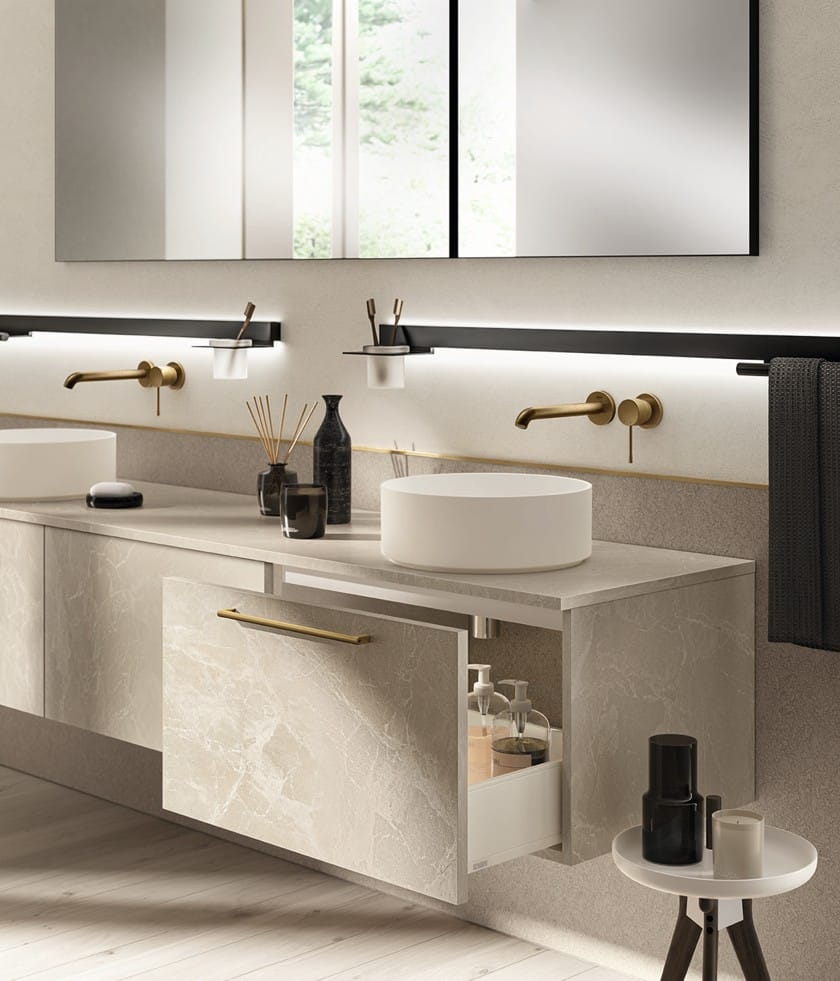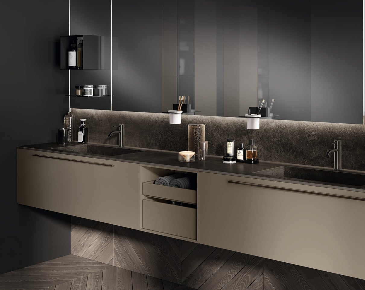 Aquo erottuu vedinjärjestelmällään, joka mahdollistaa vetimien sijoittelun täysin vapaasti. Voit valita vetimet allaskalusteiden sivuille, ovien keskelle, pystysuuntaan tai vaakaan – vapaus, joka tekee jokaisesta kokoonpanosta yksilöllisen. Kun tähän yhdistetään valolistat, jotka kehystävät allasalueen, lasihyllyillä varustetut seinäkaapit ja uritetut ovet, syntyy kylpyhuone, joka on yhtä aikaa vaikuttava ja käytännöllinen. Työtasoihin voit valita Cristalplant-, Mineralmarmo-, Corian-, Fenix- tai Ocritech-materiaalin, ja kokonaisuuden täydentävät Inner- tai Ibo-altaat. Lopputulos on tila, joka tukee henkilökohtaista aamun ja illan hyvinvointirituaalia.