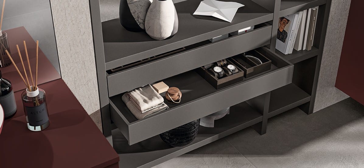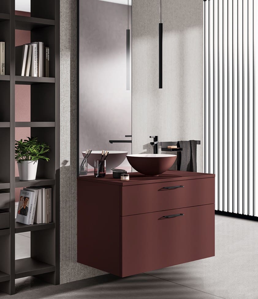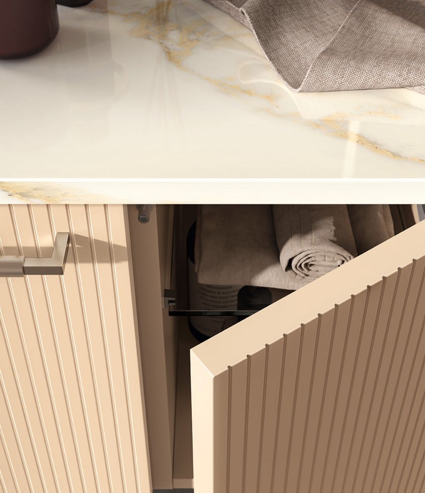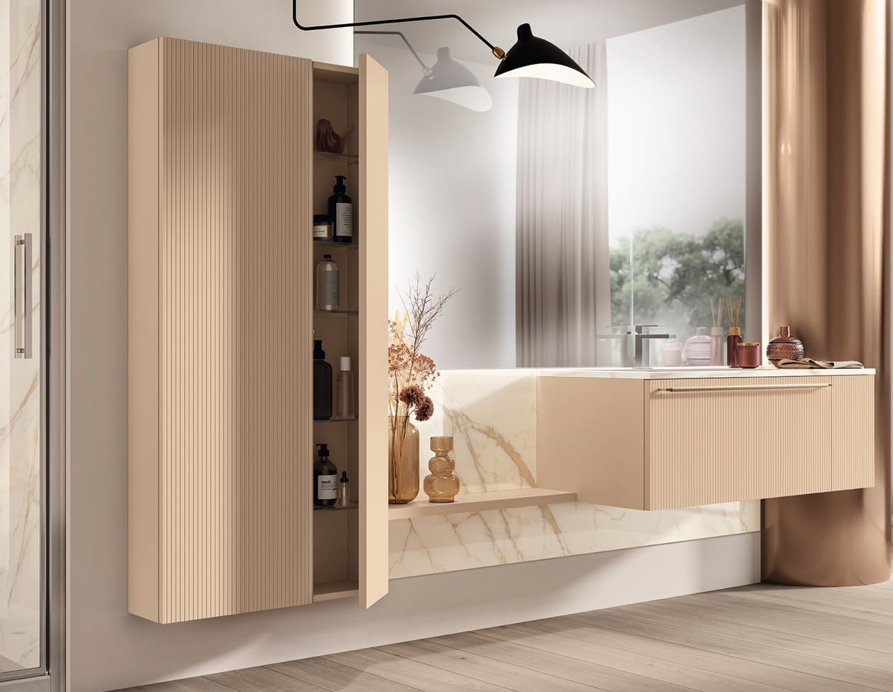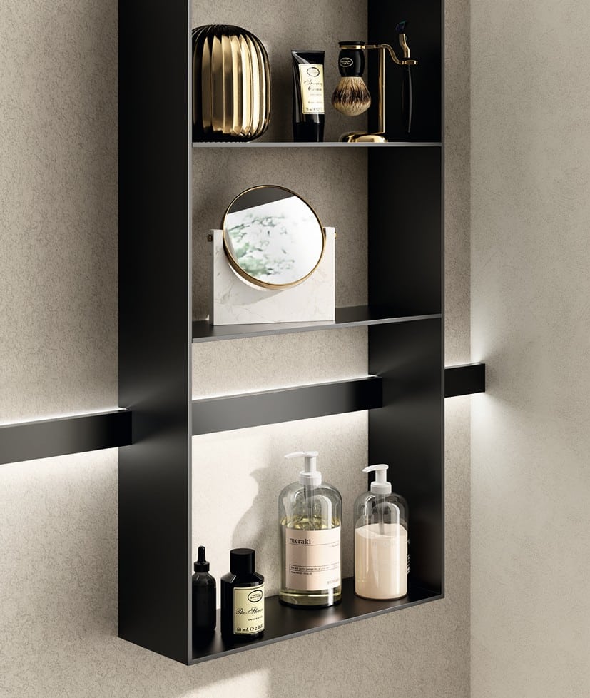 Aquo erottuu vedinjärjestelmällään, joka mahdollistaa vetimien sijoittelun täysin vapaasti. Voit valita vetimet allaskalusteiden sivuille, ovien keskelle, pystysuuntaan tai vaakaan – vapaus, joka tekee jokaisesta kokoonpanosta yksilöllisen. Kun tähän yhdistetään valolistat, jotka kehystävät allasalueen, lasihyllyillä varustetut seinäkaapit ja uritetut ovet, syntyy kylpyhuone, joka on yhtä aikaa vaikuttava ja käytännöllinen. Työtasoihin voit valita Cristalplant-, Mineralmarmo-, Corian-, Fenix- tai Ocritech-materiaalin, ja kokonaisuuden täydentävät Inner- tai Ibo-altaat. Lopputulos on tila, joka tukee henkilökohtaista aamun ja illan hyvinvointirituaalia.