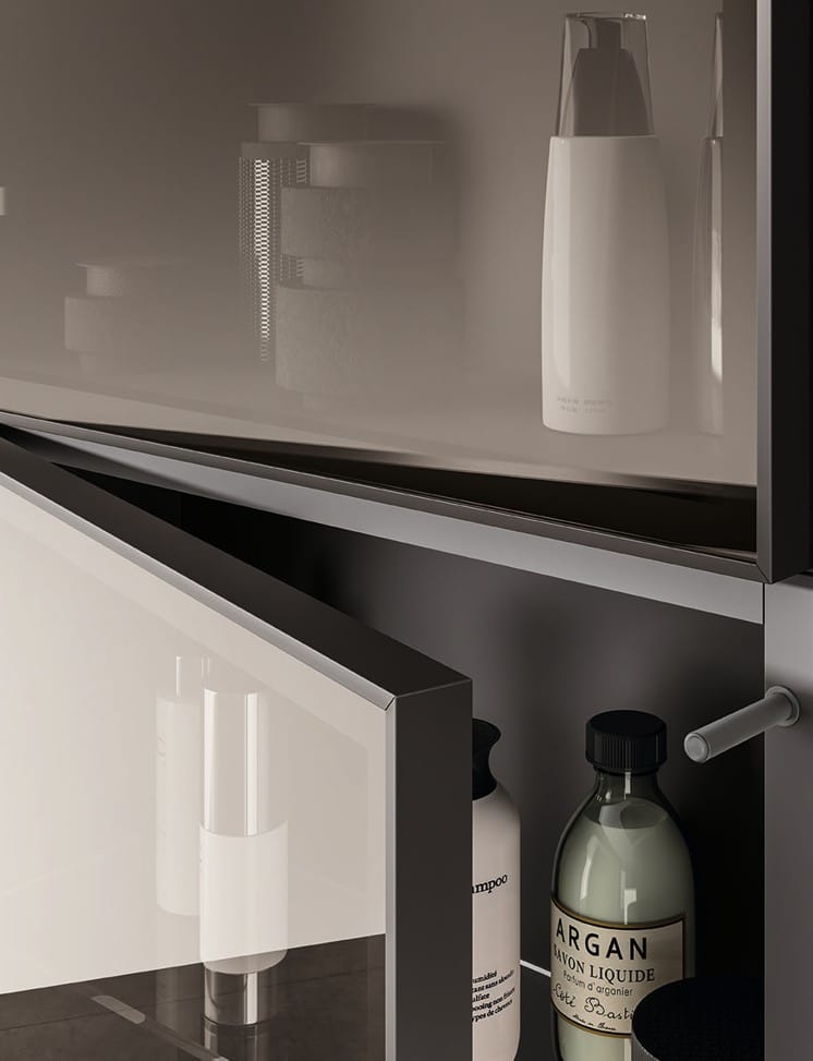 Muokkaa Aquo vastaamaan henkilökohtaista käsitystäsi hyvinvoinnista. Valitse kiilto- tai mattalakatuista pinnoista uritetuin tai tasapintaisin ovin, lisää Cristalplant-, Mineralmarmo- tai Corian-allaskalusteita ja integroidut Inner- tai Countertop Ibo -altaat. Metallisävyiset efektit tai pehmeät helmiäissävyt, seinäkaapit lasihyllyillä ja monipaikkainen vedinjärjestelmä – jokainen yksityiskohta mukautuu makusi mukaan. Aquo on modulaarinen kokonaisuus, joka skaalautuu pienestä kylpyhuoneesta laajaan kylpyoasiin ja seuraa hyvinvoinnin rituaalejasi vuodesta toiseen.