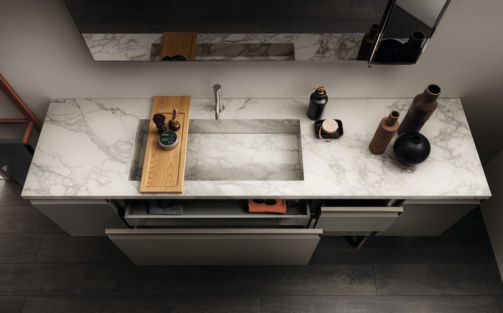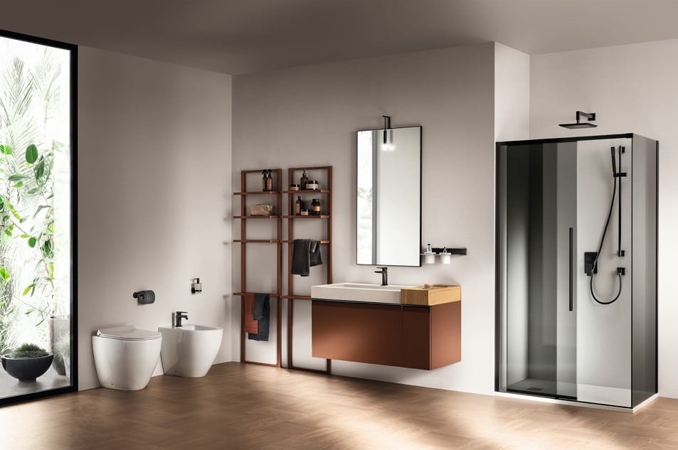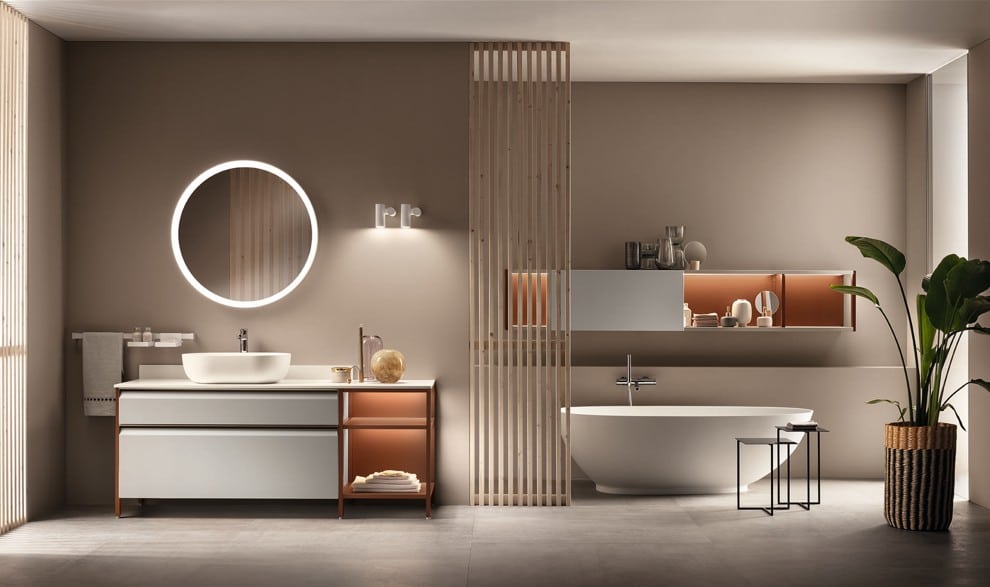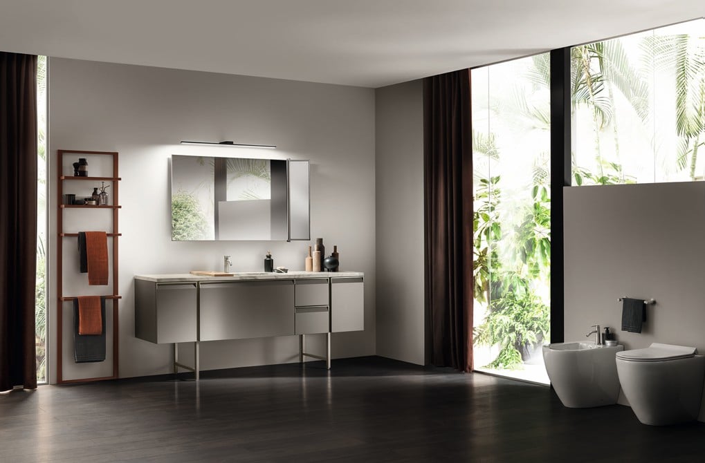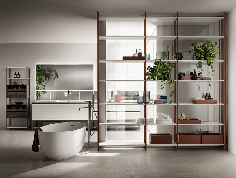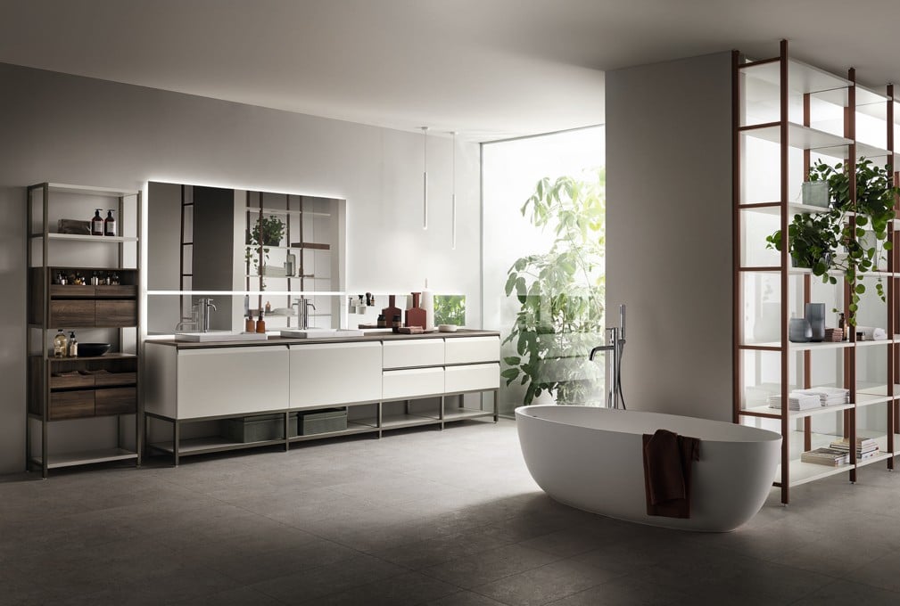 Ainoa Scavolini-kylpyhuone Status Wall Systemillä ja uristetuilla jaloilla