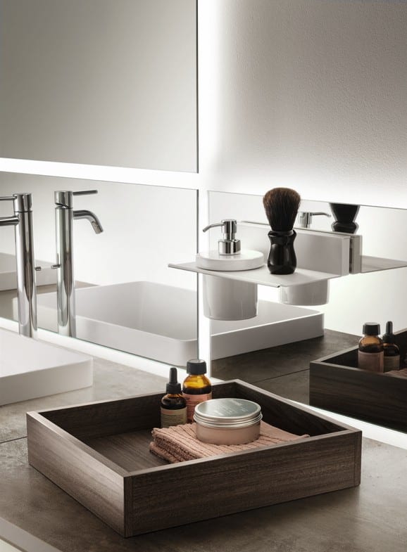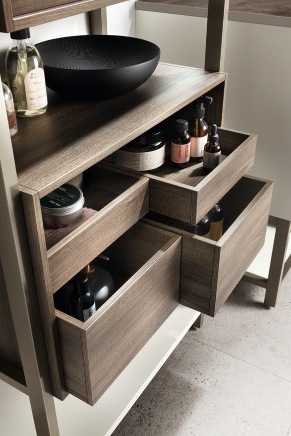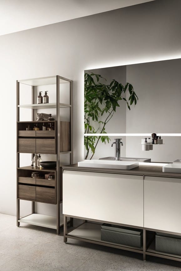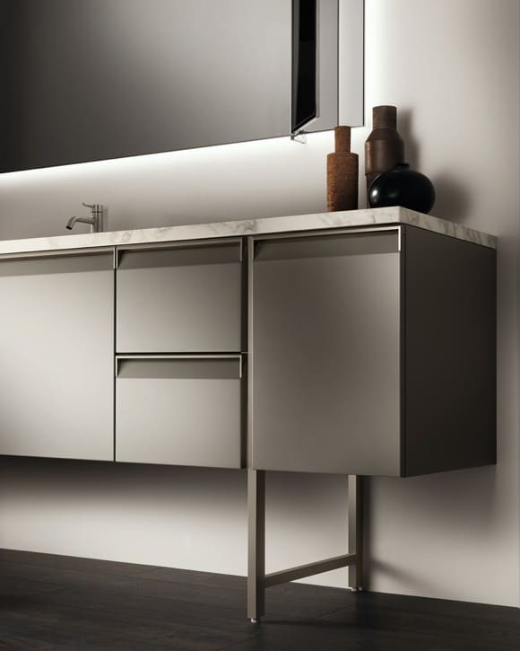 Formalian tunnusmerkki on sen modulaarinen Status Wall System – avohyllyrakenne joka määrittää kylpyhuoneen geometrian kehyksenä, päätyelementtinä tai väliseinänä eri toimintojen välillä. Rakenne tarjoaa kaiken näkyviin ja täydelliseen järjestykseen, ulosvedettävät tarjottimet ja vapaasti sijoitettavat esinesäilyttimet täydentävät tilan monipuolisuuden. Uritetut jalat tuovat keveyttä kokoonpanoihin – glamouria yksityiskohdissa. Yhdistettynä muotoiltuun oveen jossa integroitu metallkahva Titanium-reunuksella, Calce Bianco Porcelain Stoneware tai Arabescato-posliinityötasoihin ja Monolith- tai Perfect-altaisiin saat kylpyhuoneen jossa toiminto ilmaistaan elegantisti. Tämä on niille jotka ymmärtävät että kauneus syntyy muodon ja materiaalin yhteydestä.
