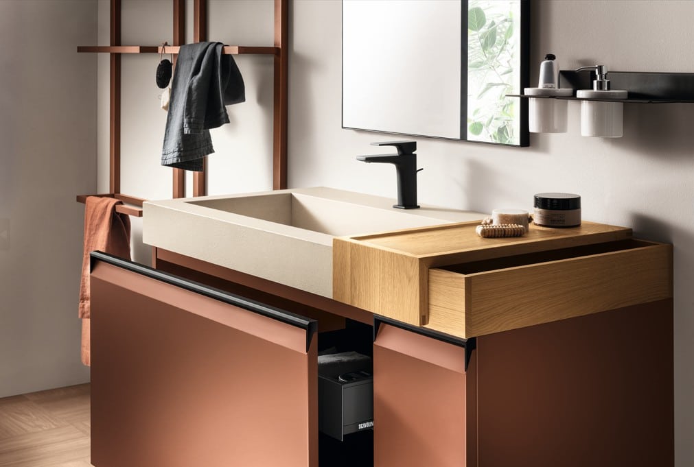 Suunnittele Formalia vastaamaan kaikkiin hyvinvointisi tarpeisiin. Valitse mattalakatuista ovista Rain PET-pinnoilla tai dekoratiivisista melamiineilla teksturoidulla ilmeellä, lisää Titanium-viimeistely joka yhdistää seinäkaapit, kahvat, jalkalistat ja Status Wall Systemin rakenteen. Rust-, Black- tai Titanium-sävyt luovat elegantin värijatkumon. Calce Bianco Porcelain Stoneware -työtasot Monolith-altailla, Ikon-peilit Fancy-valoilla ja Magneto Wall -seinätarvikkeet täydentävät kokonaisuuden. Formalia on monipuolinen – se skaalautuu kompaktista kylpyhuoneesta laajaan hyvinvointitilaan, yhtenäinen tyyli yhdistää keittiösi, olohuoneesi ja kylpyhuoneesi saumattomaksi kokonaisuudeksi.