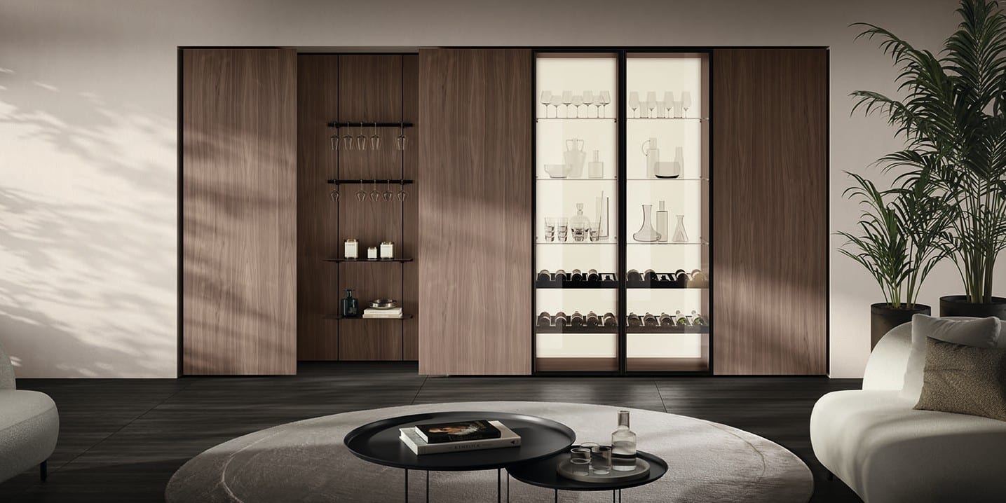 Voiko minimalismi olla lämmin ja henkilökohtainen? Vuessen suunnittelema Essenza Living todistaa, että voi. Suunniteltu open space -tilojen pääosaan, mutta myös pienempiin tiloihin, Essenza tulkitsee minimalismia lämmöllä ja persoonallisuudella ylittäen mustan ja valkoisen kanonit. 2,2 cm paksu ovi 40° kulmaleikkauksella korostaa linjojen puhtautta luopumatta toiminnallisuudesta, kaksi gola-tyyppiä (Flat ja Round) tarjoavat henkilökohtaista säätöä, ja Fluida-seinäjärjestelmä luo älykkäitä läpikulkuja tilojen välillä. Air Box -ovet alumiinitelailla ja piilokaumoilla, Sail-ovet ja Rail-tarvikekisko alumiinihyllyillä täydentävät kokonaisuuden – tämä on olohuone jossa rigori ja lämpö kohtaavat.
