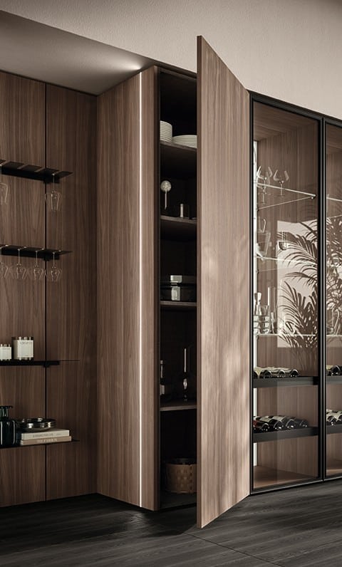 Essenza Livingin tunnusmerkki on sen kyky yhdistää tekninen innovaatio ja materiaalinen rikkaus. 2,2 cm paksu ovi 40° kulmaleikkauksella on distinctive-piirre joka korostaa linjojen puhtautta luopumatta toiminnallisuudesta – tämä ei ole pelkkä tasainen pinta vaan huolellisesti leikattu yksityiskohta joka ilmentää puhtaan design. Fluida-seinäjärjestelmä luo älykkäitä läpikulkuja ja väliseiniä tilojen välillä pitäen jatkuvuuden ja toiminnot, Rail-tarvikekisko alumiinihyllyillä tuo kevyen teollisen elementin, ja Air Box -ovet alumiinitelailla ja piilokaumoilla tarjoavat lasinäkyvyyttä ilman ulkonevia kahvoja. Quercia Toffee, Noce Classic, Rovere Gold dekoratiivisissa melamiineissa, kiiltävä Ginger-lakkaus tai matti Fenix NTM®, laminaatit strips-versiolla tai Cosmolite Mint – materiaalirikkaus on ennennäkemätön. Tämä on niille jotka ymmärtävät että minimalismi voi olla sekä rigori että lämpö.